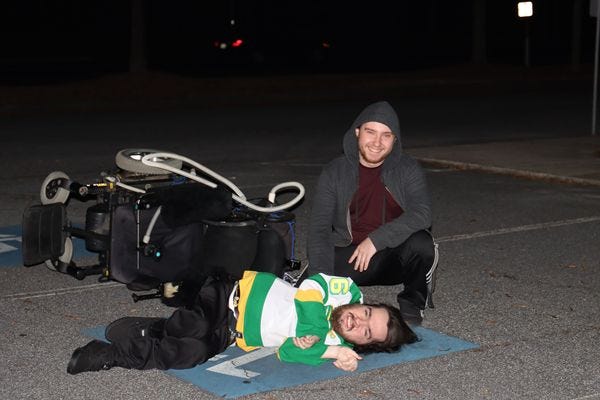 JAKE: Time for some honesty; I haven't made a lot of progress on that front yet. The challenges for performing live for us are multifaceted; ranging from my own personal physical limitations to the accessibility challenges that most venues force upon disabled people. For pragmatism, I try to focus on the concerns that I can most directly address on my own. I've been experimenting with ways to improve my singing voice and stamina, to moderate success, but I often wonder if I'm going to eventually meet a ceiling for my physical ability. The broader societal accessibility issues, I fear, Will only be addressed whenever we decide to center the needs of disabled people, but my hope is with greater visibility of the disabled experience/culture, maybe we might start seeing real tangible changes (1/2)